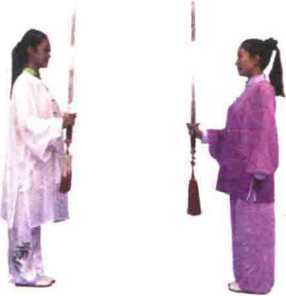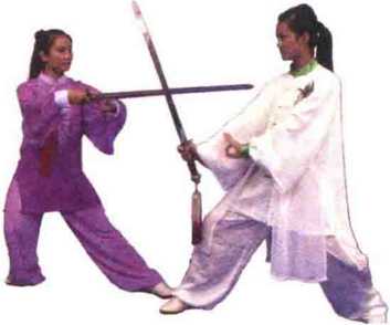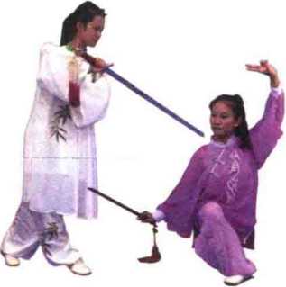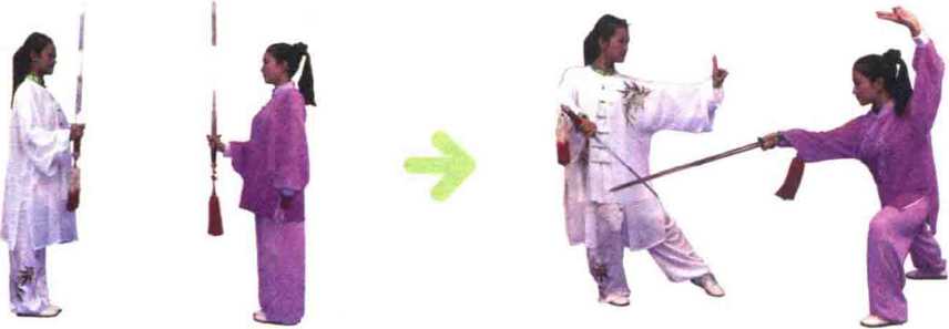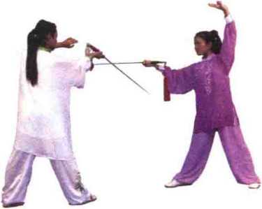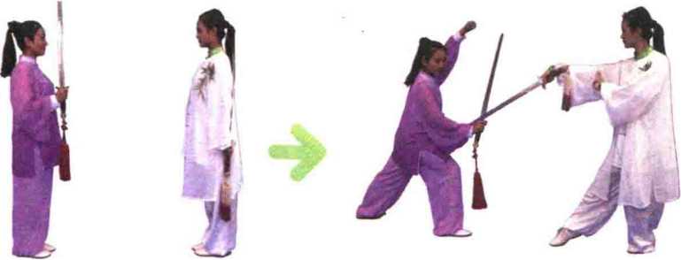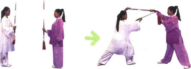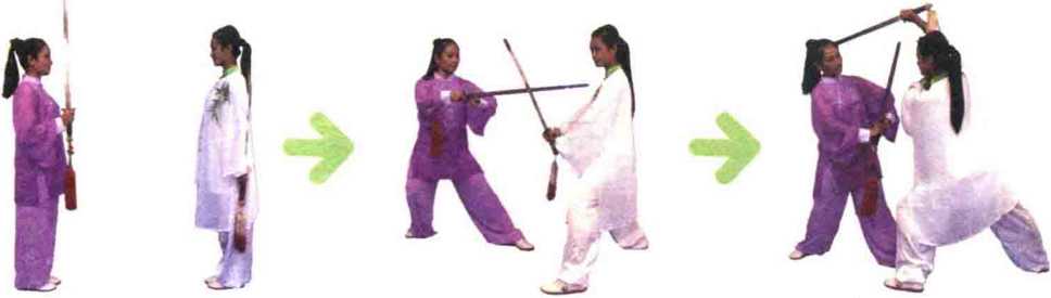 此动作攻防兼备。当敌从我右侧刺我右肋时,我用挑剑挑开,并用 反刺剑刺击位于我左侧之敌头、颈部。