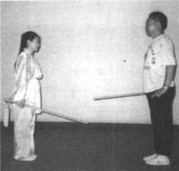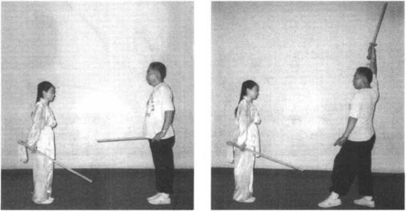 ⑵ 右弓步左抡劈剑:甲乙均右手握剑对视。甲待乙即 将上步进攻时,快速向左前上右步成右弓步,同时右手剑 在体左侧抡转一周自上向下劈击乙左肩部。(图4-14?16)