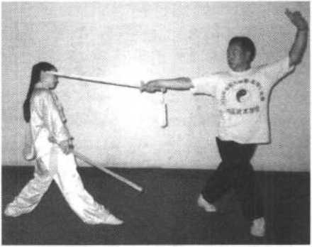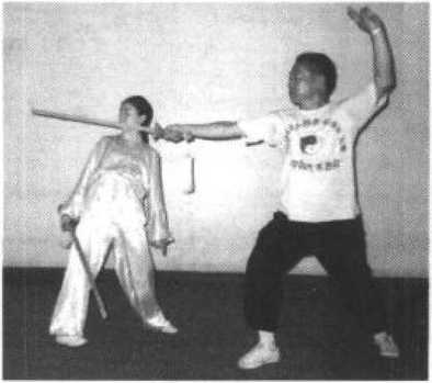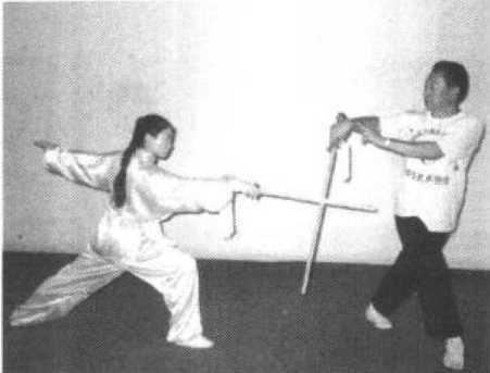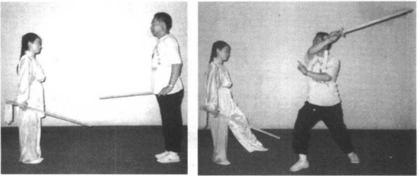转身后抡劈剑:甲乙均右手握剑对视。乙突然上右步 成右弓步直刺甲腹部;甲左后转身,右脚左跨步,同时以