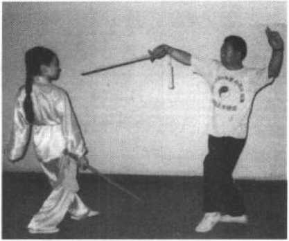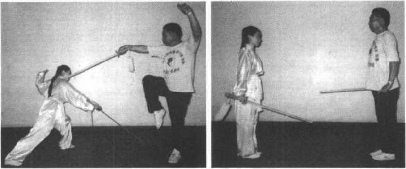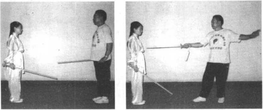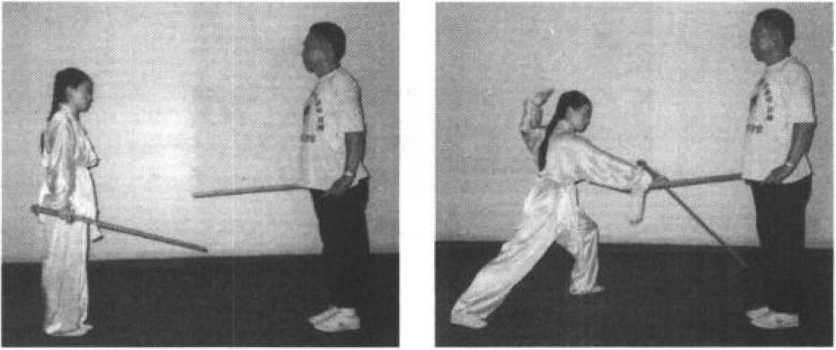 (2)左虚步斜点剑:甲乙均右手握剑对视。甲左脚在 前,突然右脚上半步,左脚尖点地成左虚步,上体稍左转, 同时右手剑举起自右斜上方点击乙脸部;乙闪身躲过。(图 4-42. 43)