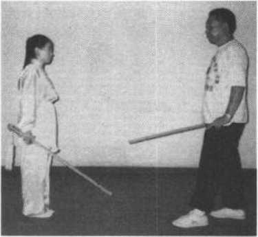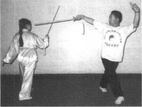 (1)转身后点剑:甲乙均右手握剑对视。甲欲用点剑进 攻,右脚先上一步举剑虚刺乙腹,待乙格档时,突然右脚向 左横开一步成叉步,同时右手剑在体左侧抡转一周,自上向 下点击乙右眼。(图4-39?41)