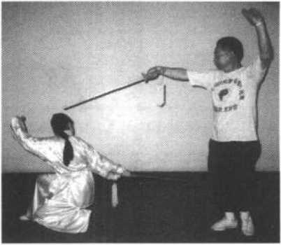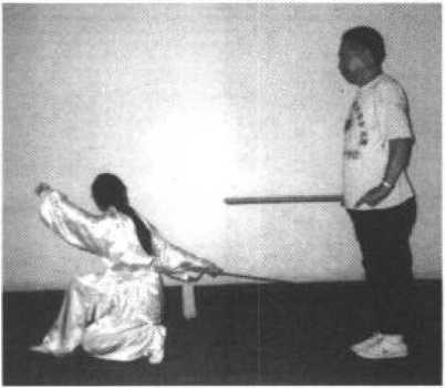 (2)左丁步点剑:甲乙右手握剑对视。乙虚刺甲后迅速 转身下蹲,准备以扫剑击甲腿部;甲早有防备,待乙未转 -100-