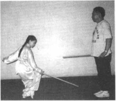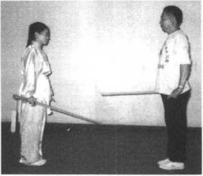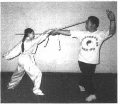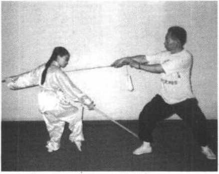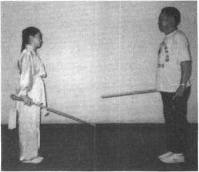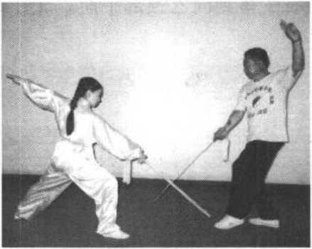 甲乙右手握剑对视。乙突然上右步举剑向前下刺击甲 右腿部;甲迅速后撤右脚,同时以剑截挡乙剑。(图4-55?57)