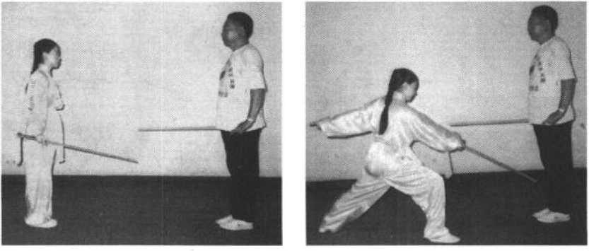 弓步平崩:甲乙均右手握剑对视。当甲意识到乙要蹲步
