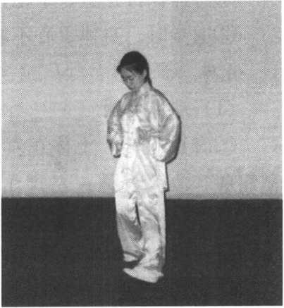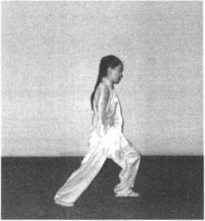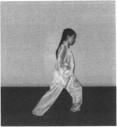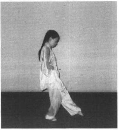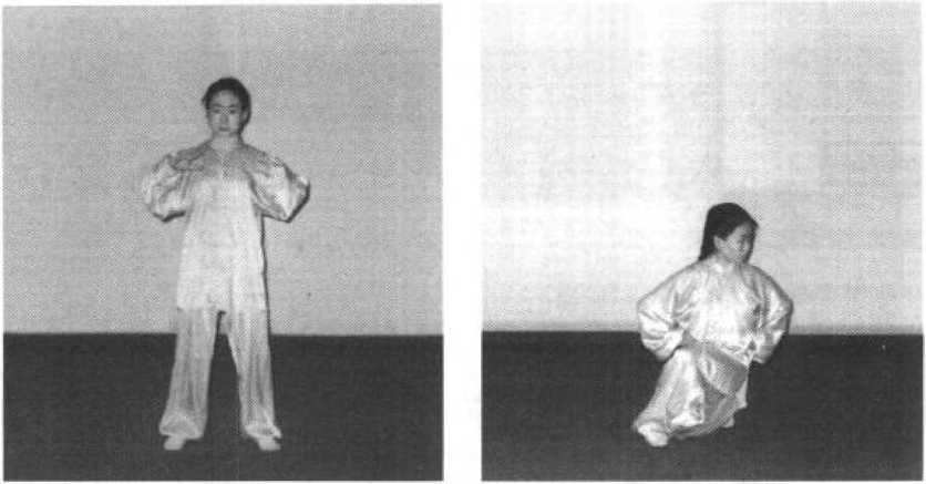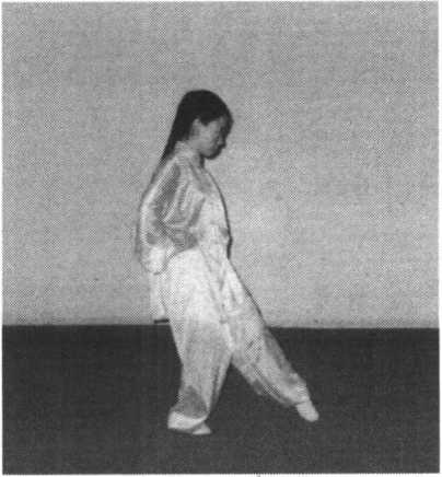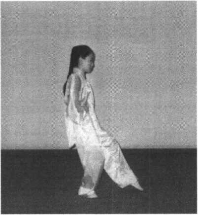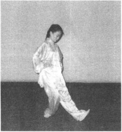 ② 脚尖碾转:身体姿势同上,换成脚尖点地,脚跟提 起向外碾(脚内扣),然后落地踏实;再提起脚跟向内碾 (脚外展),然后落地踏实。脚跟外碾、内碾反复进行8-10