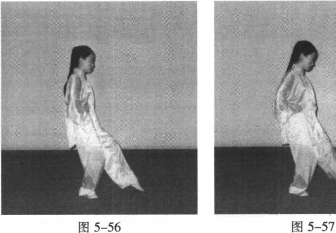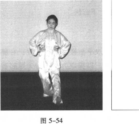 ① 脚跟碾转:上体正直,双手插腰,目视前方;右腿 稍屈膝,支撑身体;左脚在前,以脚跟为轴,脚尖翘起后 外撇,落地踏实;左脚尖再翘起后向内扣落地踏实。前脚 尖外撇、内扣反复进行8-10次。(图5-52-55)