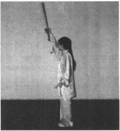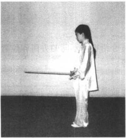 ①身体直立,两脚并拢;右手握剑直臂上举,剑尖向 上,剑刃朝前;左手剑指垂于体侧,目视前方。(图5-63、 64)