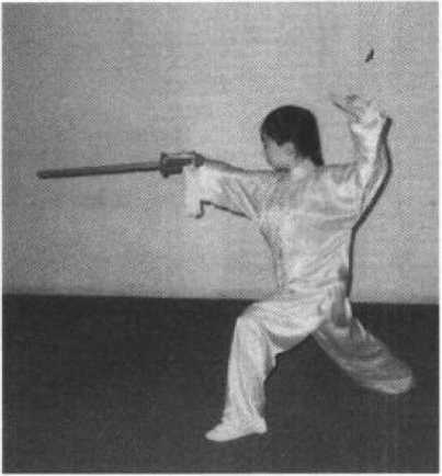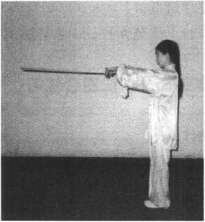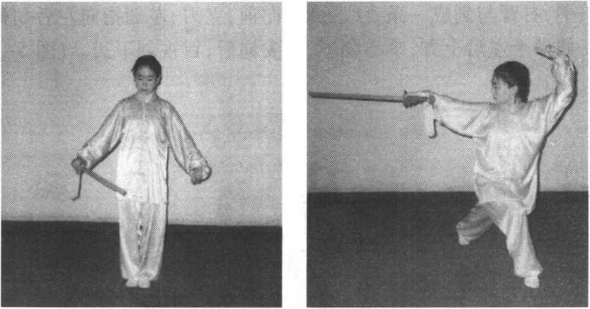 ②右手握剑向前下劈击,与肩齐平,虎口一侧向上, 右臂与剑成一条直线;左剑指屈收,附于右臂内侧;目视
