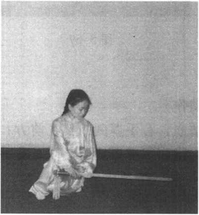 ③ 接上势,左脚向左前进步,右脚向左腿侧插睥,两腿屈 膝全蹲成左歇步;同时右手握剑向上、向左、向下侧劈,剑尖向 左,剑刃朝下;左剑指下落附于右腕;目视剑刃。(图5-68)