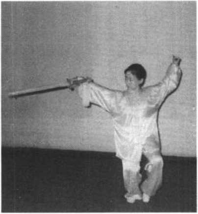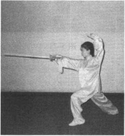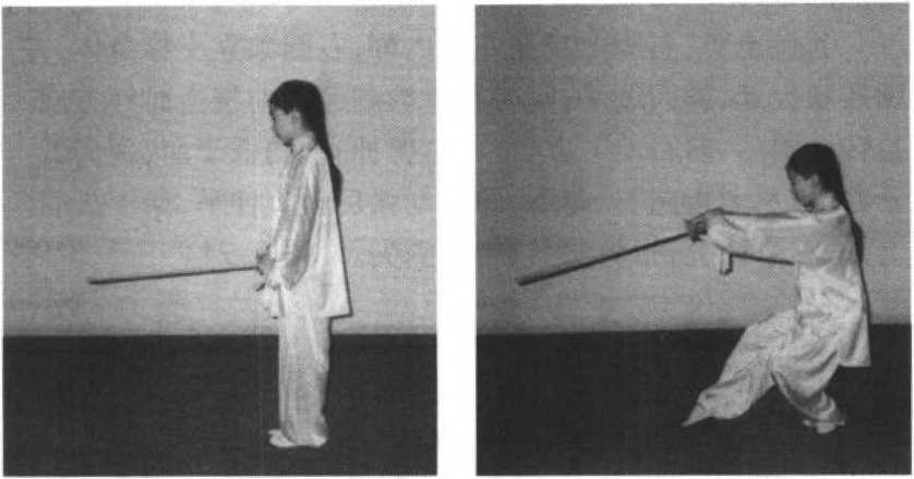 两脚并步站立,右手握剑,目视前方;左腿屈蹲支撑身 体,右脚上步,脚前掌虚点地面;同时右手握剑向前下方点 击,右手屈腕上提;左剑指附于右腕部;目视剑尖。(图 5-70. 71)