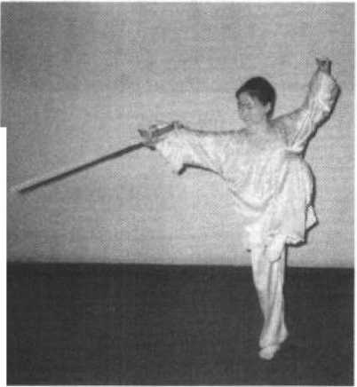 ③ 接上势,右脚上步至左脚内侧,右腿独立支撑身体,左 腿屈膝提起,脚面绷平;同时右手握剑经体前按逆时针方向 抡转一周后,向右前下方点击,右臂伸直,稍低于肩,剑尖低 于右膝;左剑指向右、向下、向左划弧后向上伸举,架于头后 上方,掌心朝上,指尖向前;目视剑尖。(图5-74)