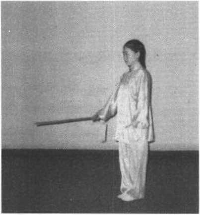 ①身体并步站立,右手握剑,左手成剑指,垂于体侧;