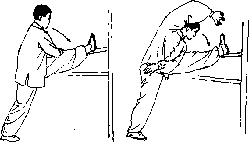 侧对肋木,右腿支撑,脚尖稍外撇,左腿提起,脚跟搁在肋 木上,脚尖勾起,右臂屈肘上举,左臂自然下垂,两腿伸直,立 腰开髓,上体向右侧做压振动作。左右交替进行。(图1一10)