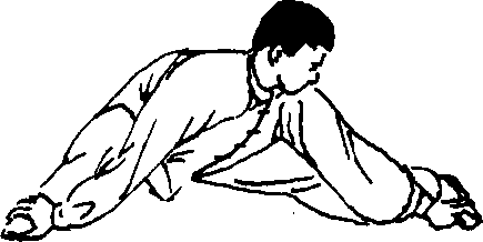 两脚左右开立,右腿屈膝全蹲,全脚着地,左腿挺膝伸直, 脚尖里扣,两手分别抓握两脚外侧,成左仆步。接着右脚蹬地, 右腿伸膝,重心左移,左膝弯曲,转成右仆步。注意挺胸、塌腰、 沉骸。(图1—11)