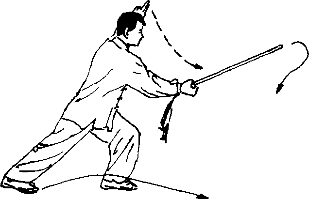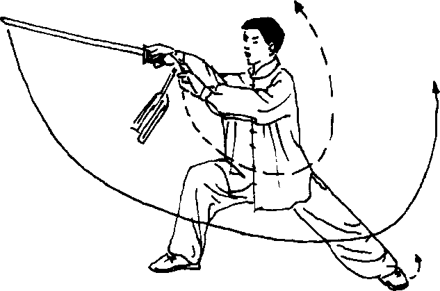 (一)上体右后转,剑随转体向右后方劈下,右臂与剑平 直,左剑指落于右手腕部;在转体的同时,右膝前弓,左腿向左 横落撤步,膝部伸直;眼看剑尖(图13—11)。