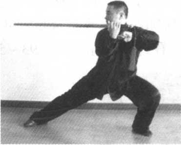 (3) 虚步前指:身体重心移向右腿,右膝弯曲,左脚撤半步,成