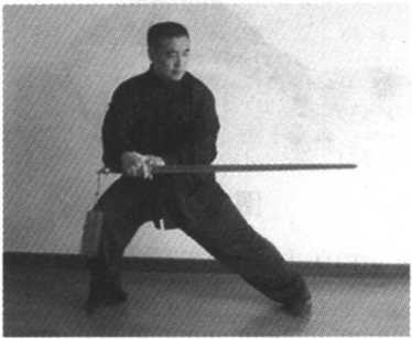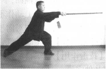 说明,在以后的传习中有了一些变化,如有的人做成剑尖与地面成 30度或45度的夹角,根据本动作“射燕”的含义,应该略向上更为 合乎此意,所以,我们认为剑尖近似水平,不宜太低。
