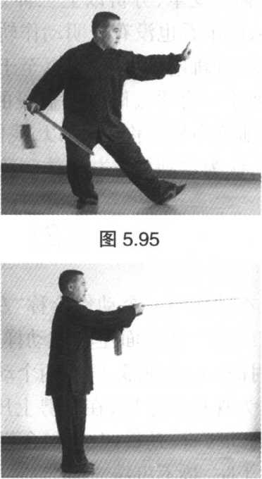 并步平刺:左脚略向左移, 身体左转,右脚向左脚并步;同 时右手持剑外旋翻转经腰间向 前平刺;左剑指内旋并向左、向 右划一小弧,再外旋翻转变掌 捧托在右手下,手心向上;眼看 前方(见图5.95?5.97)。