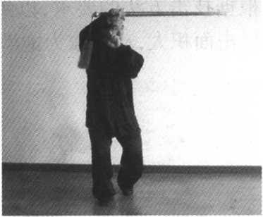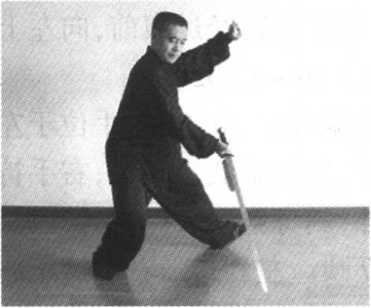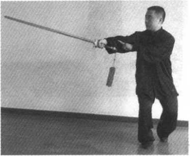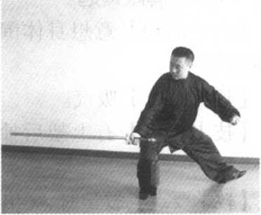 【内意活动】意想左侧腰放松,松左胯,上步。接着,意想头领、 胸含、背拔、脚蹬、手伸,合力劲贯剑尖而出。