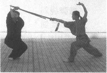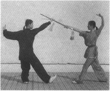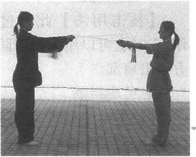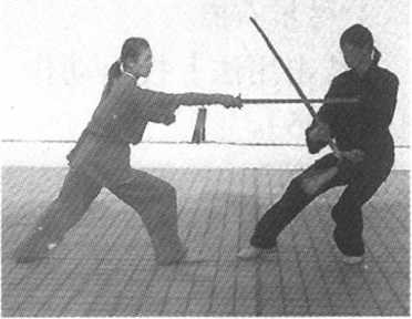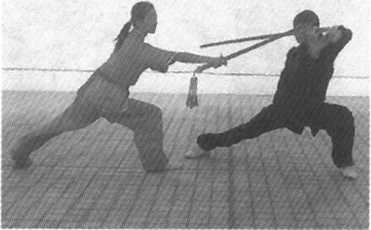 【技击用法】对方正面刺击, 我两手合力下压来械,边化对方攻 击,边直刺对方咽喉。或捧剑静待 对方变化,伺机或进攻或防守反 击(见图6.49)o
