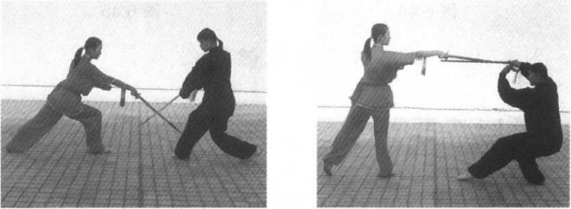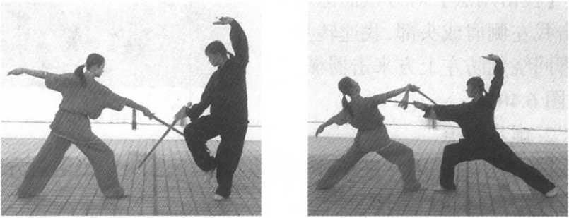 【技击用法】对方正面深度 刺击我左侧肩或头部,我速转身 收脚回绕剑防左上方来击器械 (见图 6.40)o