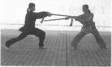 【技击用法】右手持剑回抽 割拉对方手腕,同时左剑指戳点 .对方眼睛或其他穴道,这也是一 个藏剑的预备姿势(见图6.48)o