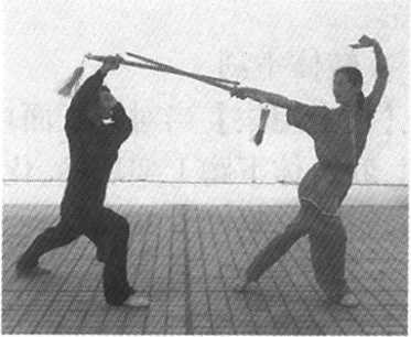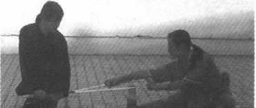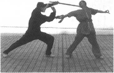 【技击用法】正面右下侧受 到攻击,我立即向下挂开来击器 械(见图6.56)o