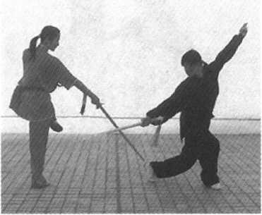 【技击用法】侧身闪开对方的攻击,反手上刺对方咽喉、耳门 等部位(见图6.57)o