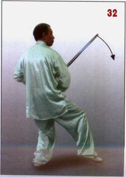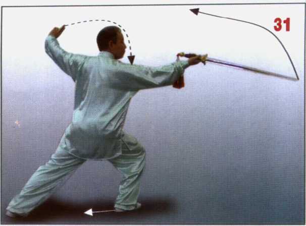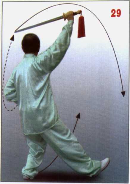 2 .右手持剑由前向下、向后再向上沿身体左侧抡绕成一个立圆, 顺势向前下方劈出,剑尖略高于膝,上体配合剑的下劈微微前倾。左 臂向后上方圆满地撑开。