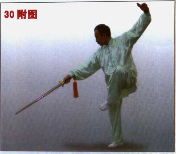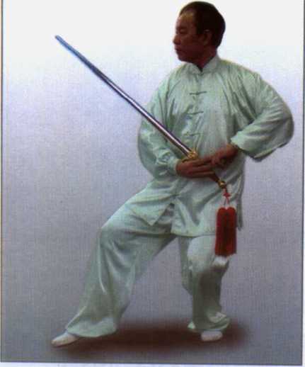 2 .抽剑时,右手持剑没有外旋上提动作,而是剑直着抽回。