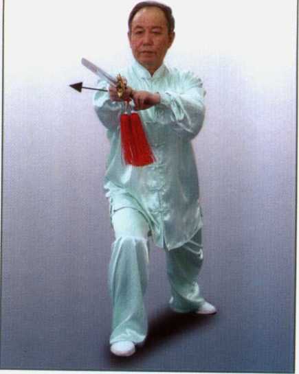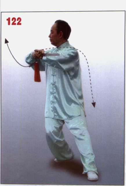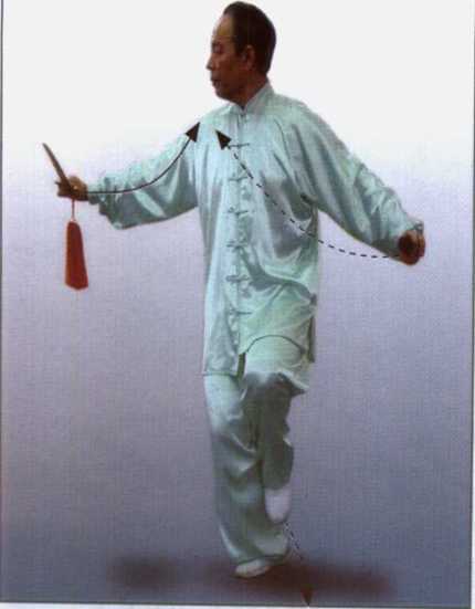接剑时,左掌心向外,拇指向 下,与右手相对;两肘和两肩要松沉。