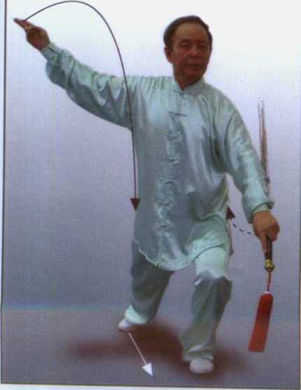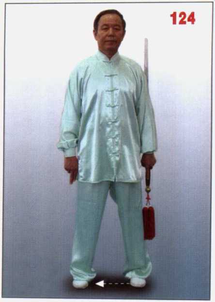 身体左转,重心前移,右脚向前 跟步,与左脚平行成开立步;同时左 手接剑,经体前垂落于身体左侧;右 手变成剑指向下、向后划弧上举,再 向前、向下落于身
