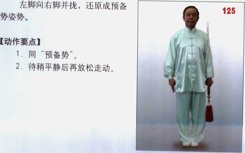 重心后移,上体右转,同时右手 持剑屈臂后引至右侧,手心向内;左 剑指随右手屈臂回收,并变掌附于 剑柄,准备接剑,眼看剑柄。