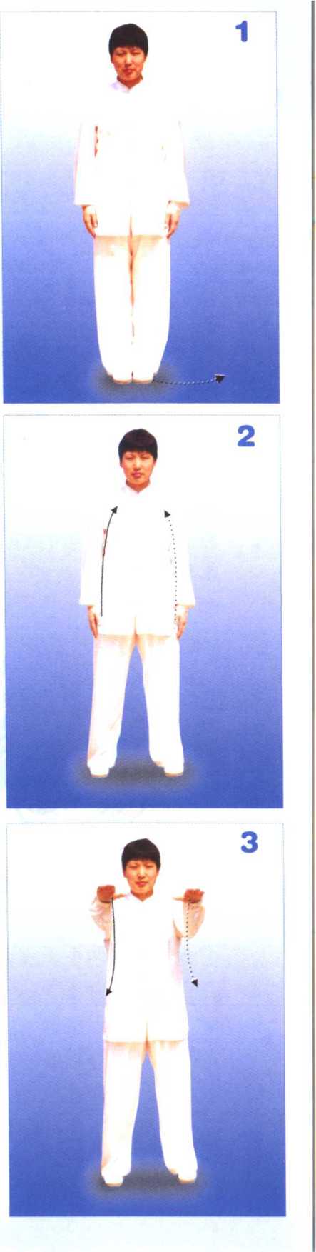 1. 左脚向左慢慢开步,两脚相距 同肩宽,脚尖向前(图2)。