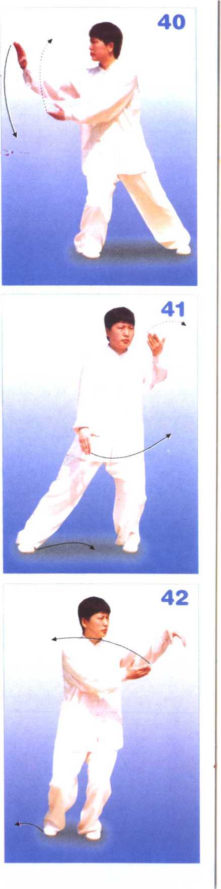 二、重心再移向左腿,左腿屈蹲, 上体微左转;同时左掌向上划弧于颏 前,掌心向里,右掌向下弧形落于胁 旁;接着右脚收至左脚内侧,右脚尖 点地;同时上体继续左转,随之左掌 经面前内旋弧形运转至左侧,掌心翻 向外,腕同肩高,指尖向上;右掌向 左经腹前弧形运转至左肋前,掌心向 后上方。目随视左掌(图41、图42)。|32式太极拳