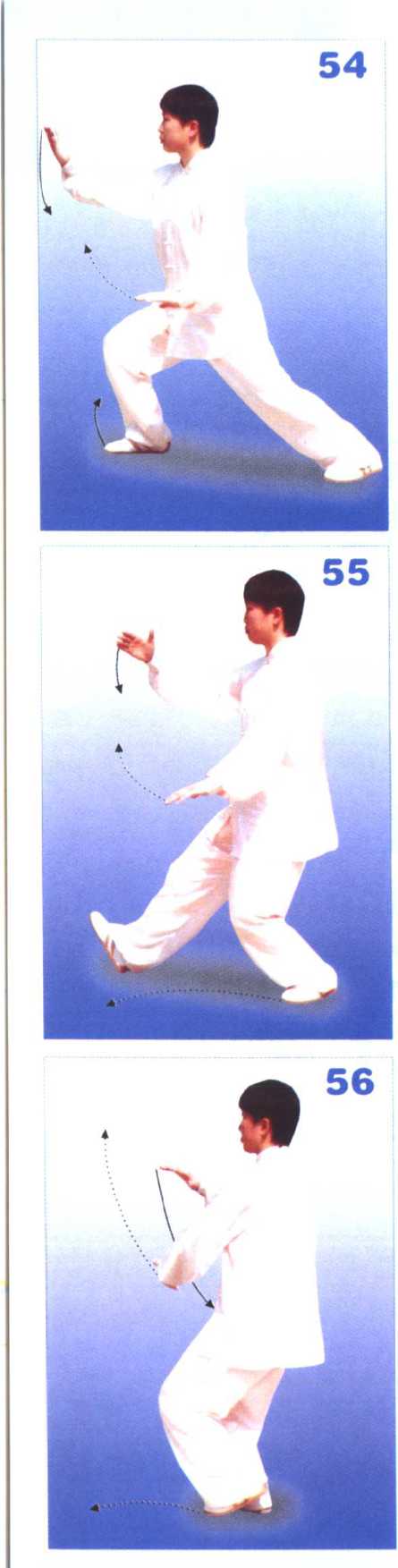 26上体慢慢后坐,身体重心移至左腿并屈膝,右脚尖上翘、外摆约...