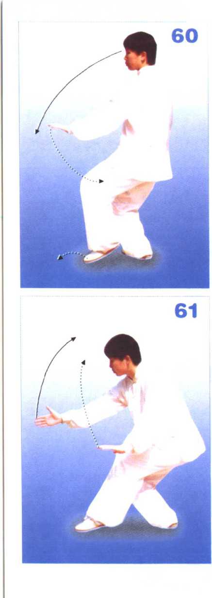 2.重心后移至右腿,右脚踏实, 左脚跟提起,上体微右转;右掌弧形 提至耳侧,左掌向右、向下划弧横至 腹。目视左掌方向(图60)。