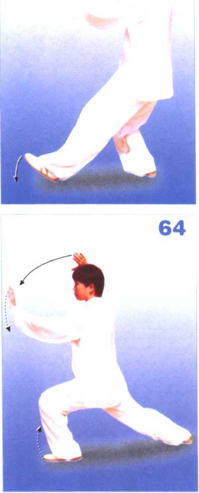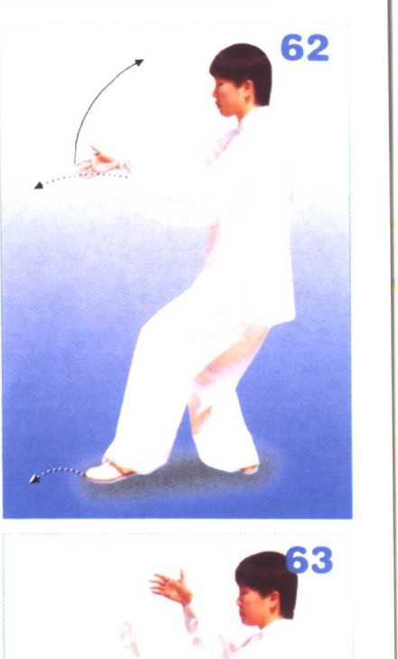 上体微右转,左提是起M如上 步,脚跟着地,而后左腿屈膝前弓成 左弓步;同时右手由体前上提,屈臂 上举,停于右额前上方,掌心翻斜向 上,拇指向下;左手上起,经胸前向 前推出与鼻同高,掌心向前。目视左 手(图62、图63、图64)。