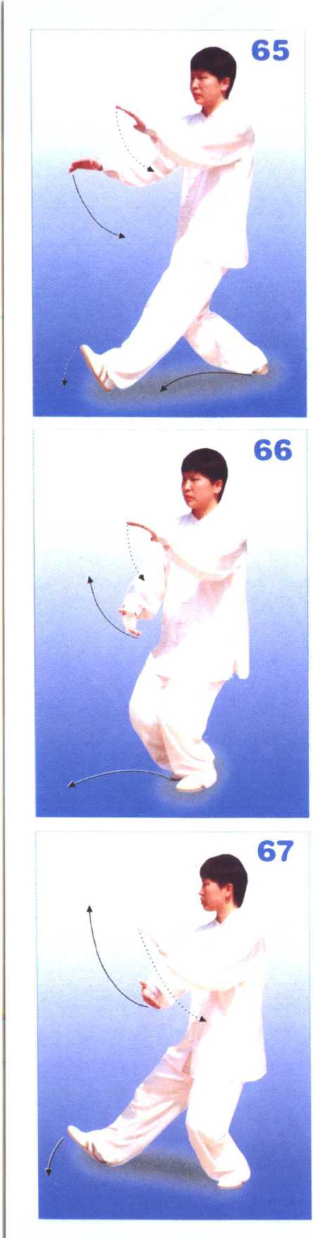 1. 上体后坐并向左转,重心移向 右腿,左脚尖外摆;两掌举于胸前, 掌心均向下;接着左脚踏实,重心移 至左腿并屈蹲,右脚收至左脚内侧; 同时两臂微屈,两手左上右下在左体 前相合,成抱球状。目视左掌(图 65、图66)。