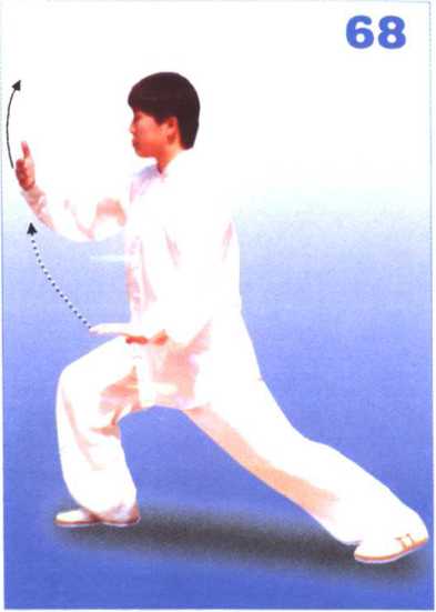 2. 右脚向右前上步,脚跟着地, 随即全脚踏实,屈膝前弓成右弓步; 同时右前臂向前上方棚出,高与肩 平,掌心向里,左掌向左下落,按于 左胯旁,掌心向下,指尖向前。目视 右前臂(图67、68)。