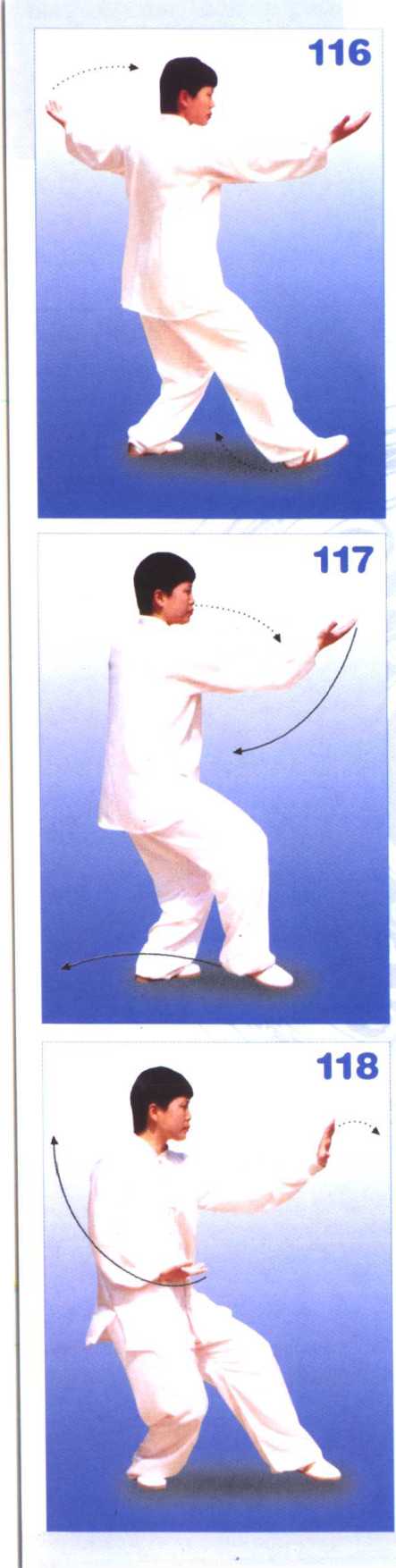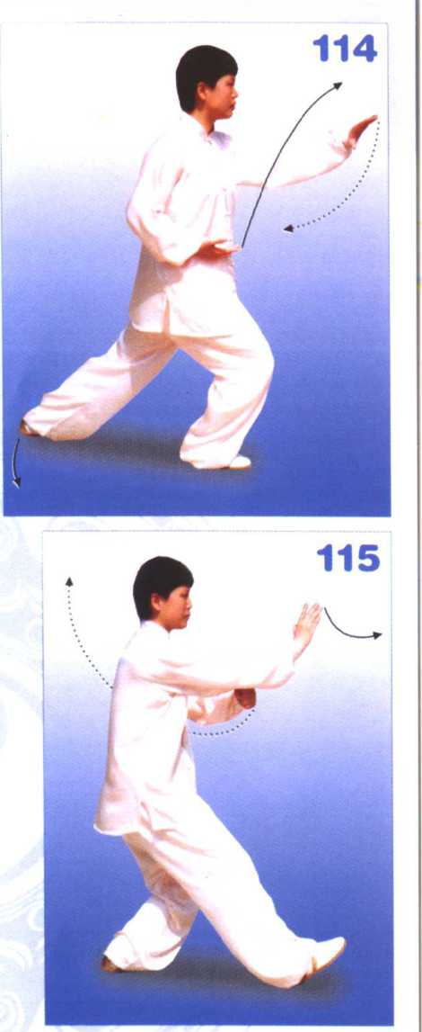 1.上体后坐,重心移至右腿并屈 蹲,左脚尖上翘稍内扣,上体微右 转;左掌下落与肩平,掌心翻向上, 右掌弧形收至右腰前,掌心向下。目 视左掌方向(图113)。