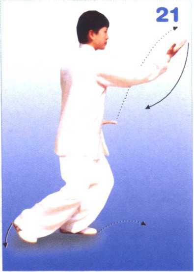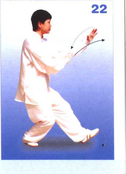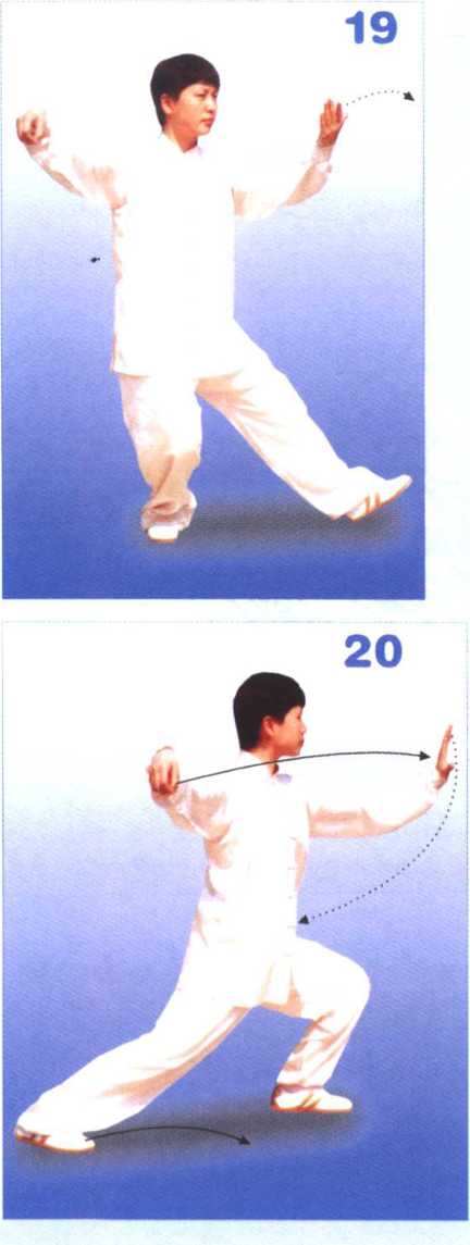 2. 上体继续左转,重心移向左腿 成左弓步;左前臂内旋,左掌翻转向 前推出,掌心向前,腕同肩高。目视 左掌方向(图20)。