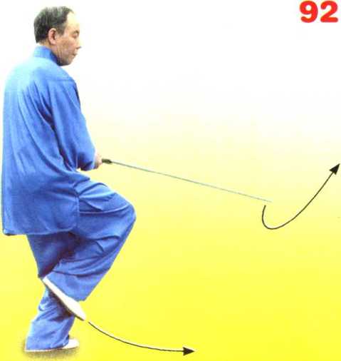 身体重心前移,右脚 收至左脚内侧(脚不触 地);同时右手握剑内旋 划孤拨剑,腕同腰高,手 心朝下,剑尖朝左前下 方;左手剑指屈肘下落附 于右腕内侧,手心朝下。 目视剑尖。(图92)