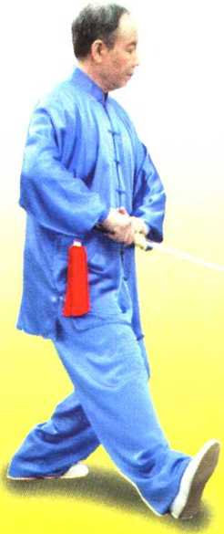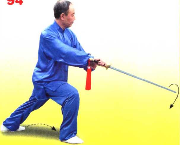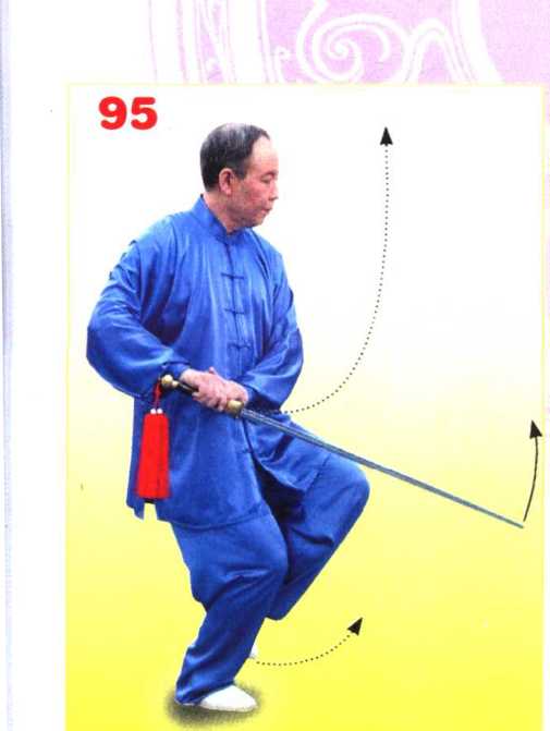 身体重心移至右腿;左脚收 至右脚内侧(脚不触地),上体右 转;同时右手握剑外旋划弧拨剑 至右胯旁,手心朝上,剑尖朝右 前下方;左手剑指附于右腕内侧, 手心朝下。目视剑尖。(图95)