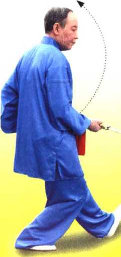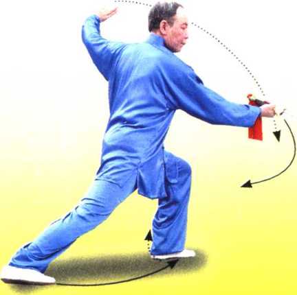 ① 划弧拨剑时屈臂 翻腕,剑尖形成一小圆 孤。截剑时弓腿转腰, 动作柔和连贯。整个过 程要以腰带臂,以臂领 剑,转腰旋臂,肘关节 屈伸,剑把左右弧线大 于剑尖弧线。