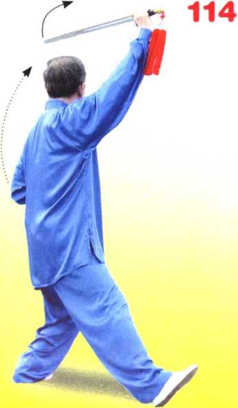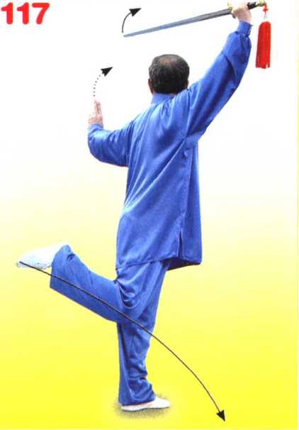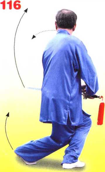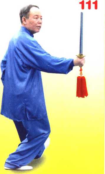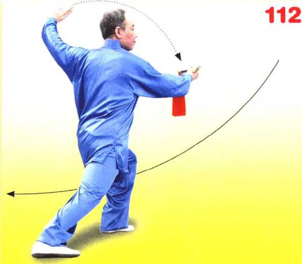 身体重心前移,右脚收至左 脚内侧(脚不触地);身体左转; 同时右手握剑,剑刃领先经下向 左后方划弧抡摆至左腹前,臂微 屈,手心斜朝上,剑尖朝左后下 方,与胯同高;左手剑指屈肘向 下落于右前臂上,手心朝外;目 视剑尖。(图113)