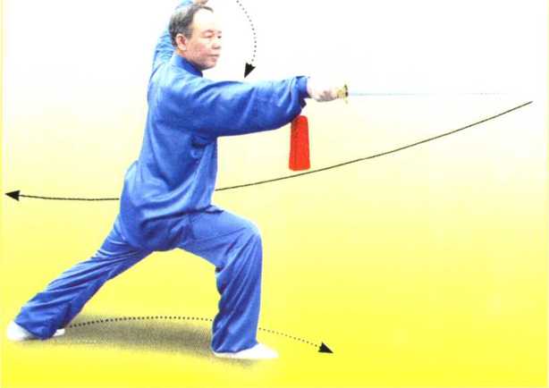 ④ 抹剑时直臂挥摆,剑尖向前,做成斩剑。