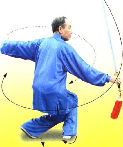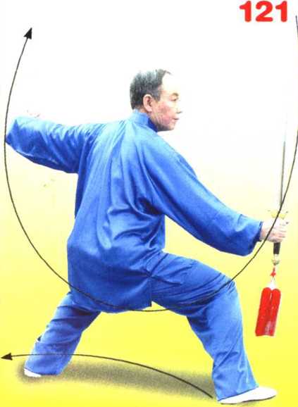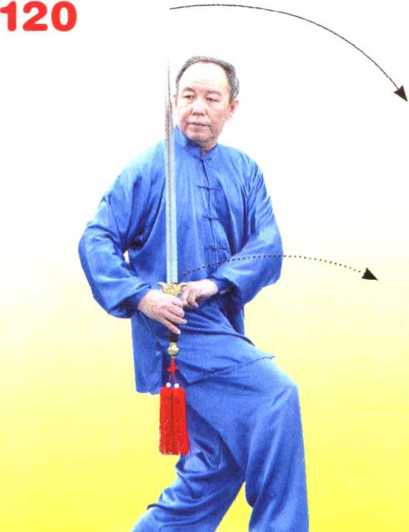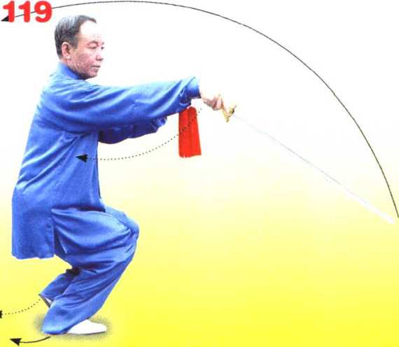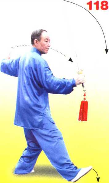 左腿屈膝,身体略右转;右 脚向右落步,脚跟着地,腿自然 伸直;同时右手握剑略向右摆举 使剑尖斜向上,高于右腕。目视 左前方。(图118)