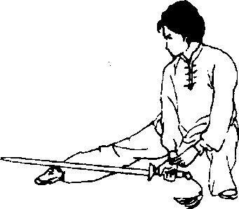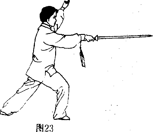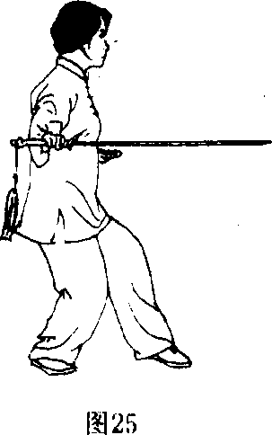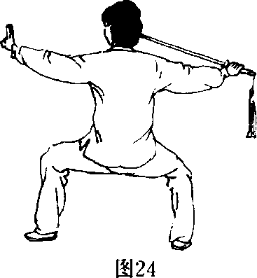 ① 弓步前腿全脚着地,脚尖向前,屈膝前弓,膝部不得超 过脚尖;后腿自然伸直,脚尖斜向前方,全脚着地;两 脚横向距离10—20厘米(图23) o② 马步两脚左右开立,约为脚长的3倍;脚尖正对前方, 屈膝半蹲(图24)。③ 虚步一腿屈膝下蹲,全脚着地,脚尖斜向前45。;另一 腿微屈,以脚前掌或脚跟点于身前(图25)。④ 图26图26仆步图26图26一腿屈膝全蹲,膝与脚尖 稍外展;另一腿自然伸直,平铺 接近地面,脚尖内扣,两脚全脚 着地(图26)。