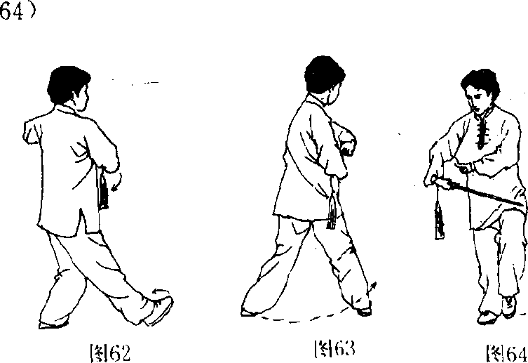 1. 后移平带左腿屈膝,重心后移;右腿自然伸直,脚尖上翘。 右手握剑平带于左胸前,手心向上;左手剑指落于胸 前,手心向下。目视前方。(图62)2. 扣脚转体右脚尖内扣落地洞时,右手握剑收至右腰侧;左 剑指置剑柄前上方。随之,右脚以前脚掌为轴,向左后 转体;左腿屈膝提起,膝同腹高。目视左前方。(图63、